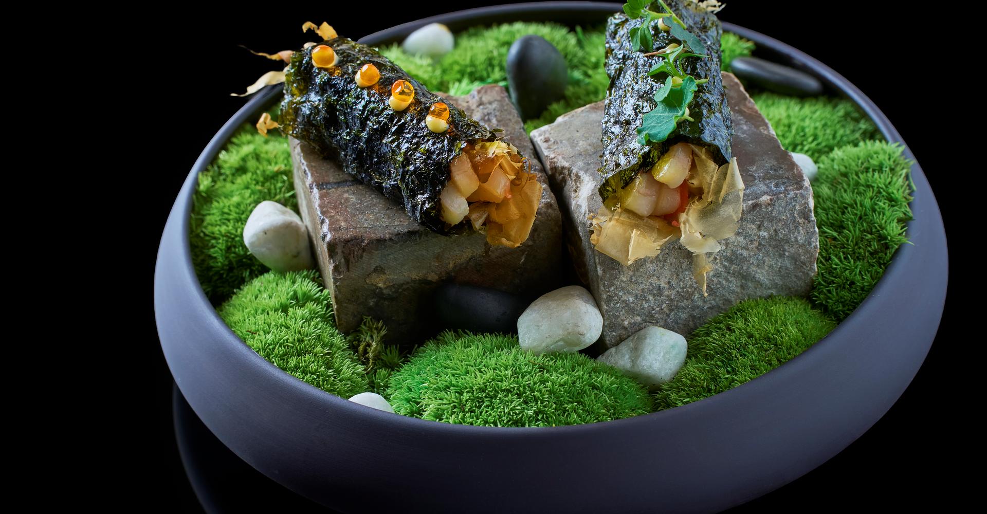 Mořský vlk / Nori / sušený Tuňák / Zázvor / Kaviár / Perilový olej